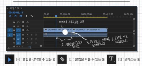 5. 컷편집 단축기 : 꼭 손에 익혀야하는 컷 편집 단축기. 가장 기본이 되는 것은 편집 단축기인데, [c]로 자르고 [v]로 선택 -> [Del]로 지우기만 하면 끝!!