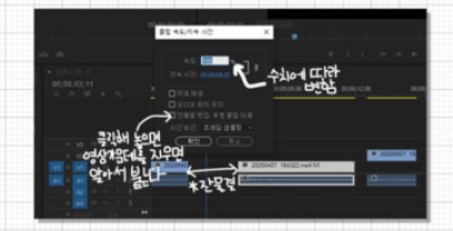 6. 속도조절, 잔물결 : 속도조절 및 영상 거꾸로재생 등등. 영상클립은 [v]키로 선택해준다음에 단축기 crtl + R을 눌려주면 퍼센트로 속도조절이 가능함!