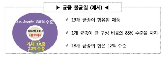 대다수 소비자는 프로바이오틱스 균종 수가 많을수록 효과가 좋을 것으로 기대하지만 대부분의 제품이 대표 균 1~2종에 편중되어 있어 미량 균종에 대한 최소 함량 기준 및 표시기준 마련이 필요하다.